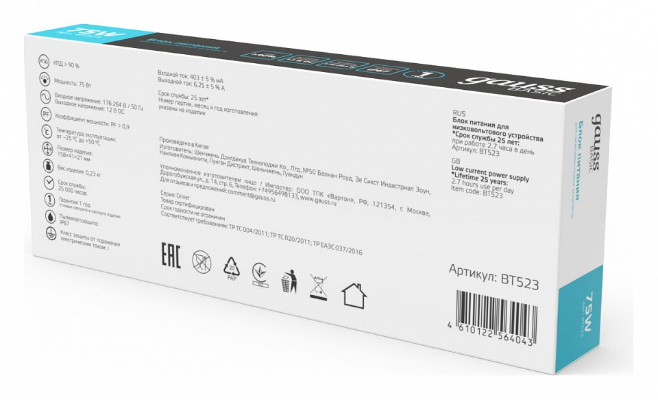 | Альтернативное название | Блок питания с проводом Gauss BT523 |