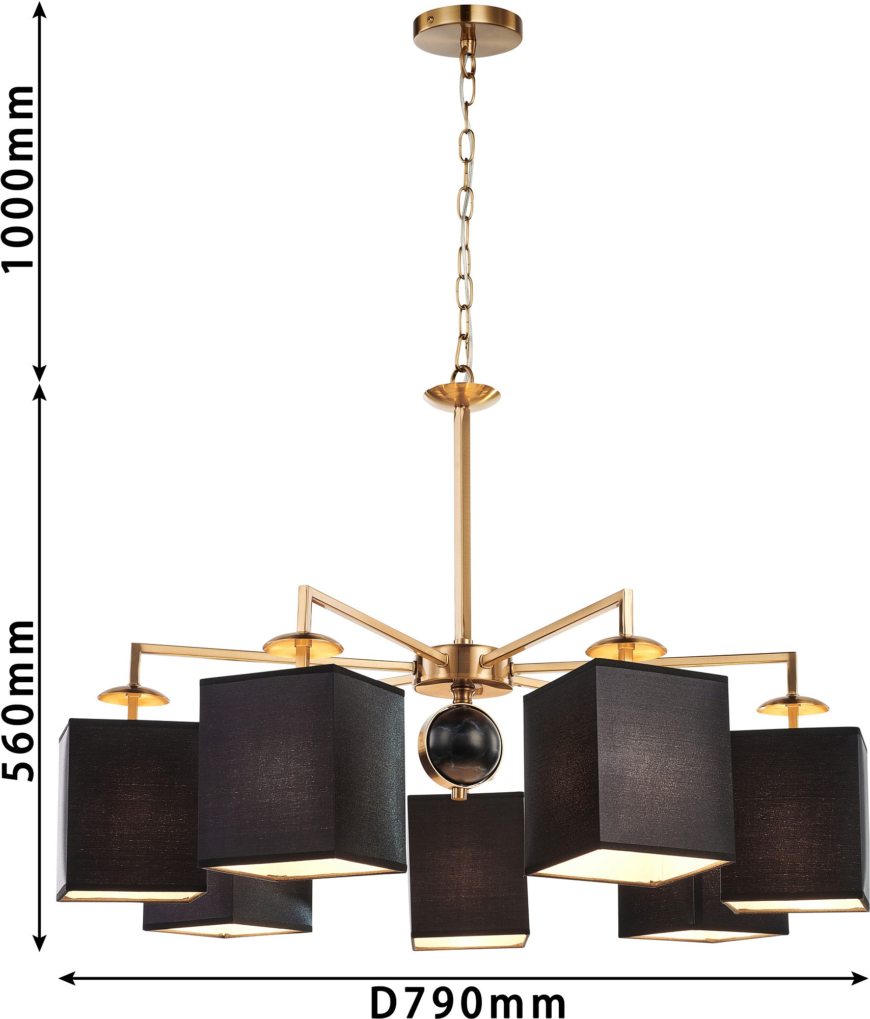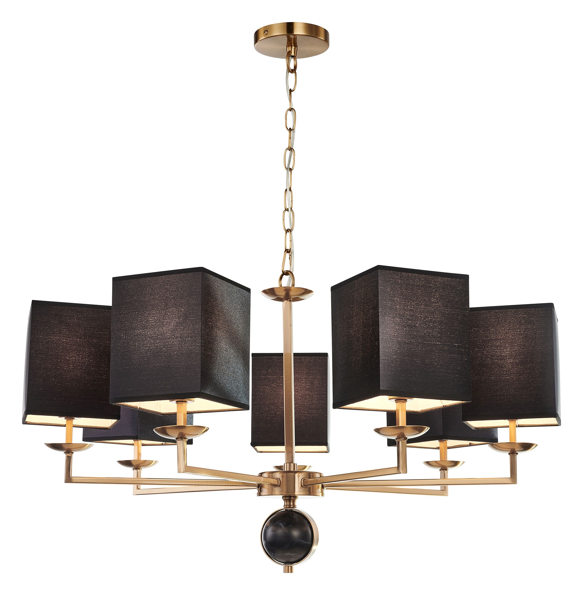 Металлический каркас в цвете античная латунь, плафоны из черной ткани, декор - имитация черного мрамора, каркас можно монтировать как вверх, так и вниз плафонами. Коллекция Diva выполнена в двух цветах на выбор — хром или античная латунь. Плафоны квадратной формы, обтянутые белой или черной тканью, гармонично дополняют рожки, которые выполнены из квадратного профиля и имеют прямой угол сгиба. Центральный декоративный элемент выполнен в технике мраморирования. Люстры оснащены системой 2в1, которая позволяет монтировать люстры как вверх, так и вниз плафонами.