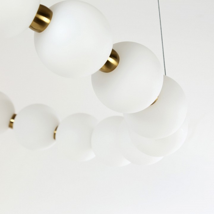 Металлический каркас цвета золота, плафон состоит из акриловых шаров белого цвета. Gubbare – светодиодная коллекция в виде белоснежного ожерелья на золотом каркасе. Плафоны выполнены из акриловых шаров белого цвета высокого качества. Они пропускают и рассеивают свет ровнее и мягче, чем обычное стекло. И в отличие от него, мало весят, легки в уходе и невероятно прочны (не бьются). Это незаменимая модель, которая станет не только новым арт-объектом интерьера, но и прекрасно его осветит. Не слепит глаз. Подвесные люстры можно регулировать по высоте.